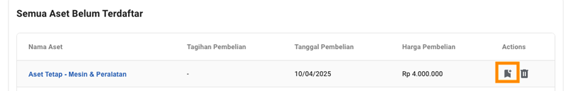 - Pada bagian Aset Belum Terdaftar, klik ikon Catat Sebagai Aset Aktif