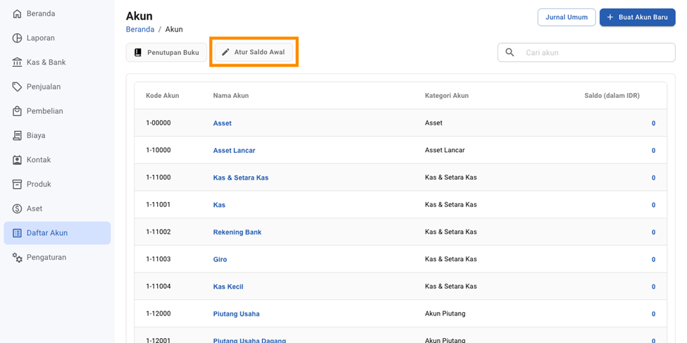 - Masuk ke menu Daftar Akun, lalu pilih Atur Saldo Awal