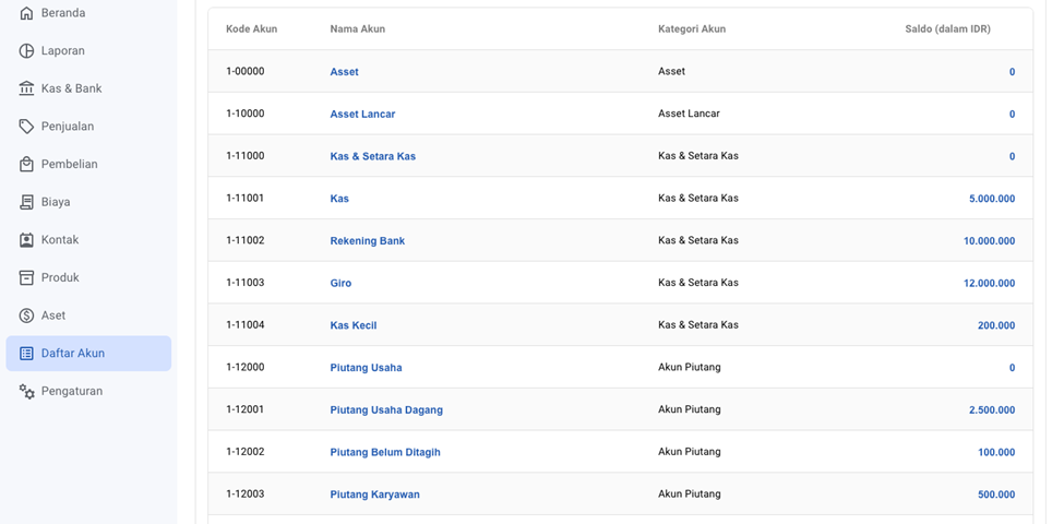 - Saldo awal akan tampil pada kolom Saldo (dalam IDR) di menu Daftar Akun