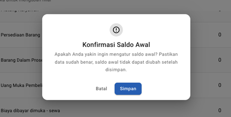 - Akan muncul pop-up konfirmasi saldo awal, pastikan data sudah sesuai lalu klik Simpan kembali