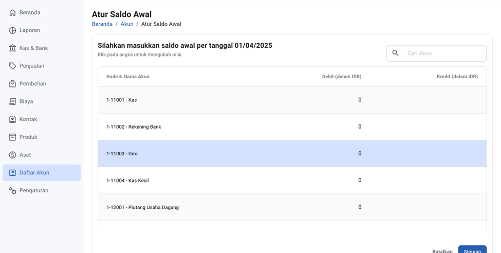 - Isi saldo awal pada masing-masing akun dengan klik angka 0, lalu sesuaikan dengan saldo pada pembukuan sebelumnya