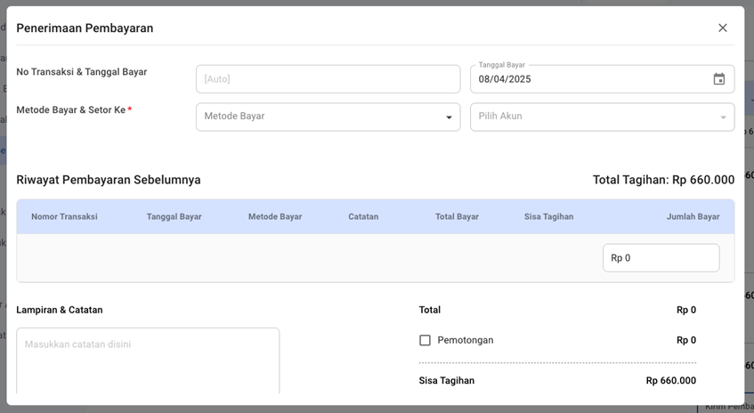 Setelah invoice pembelian dibuat, pembayaran kepada supplier perlu dicatat agar status utang dapat terpantau dengan baik. Fitur Kirim Pembayaran membantu pengguna mendokumentasikan setiap pelunasan, baik sebagian maupun penuh, terhadap invoice pembelian yang telah dibuat.