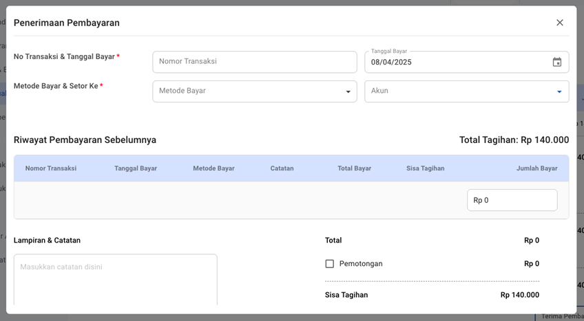 Fitur Terima Pembayaran digunakan untuk mencatat setiap penerimaan pembayaran dari pelanggan atas invoice penjualan yang telah dibuat. Melalui fitur ini, pengguna dapat mendokumentasikan pembayaran baik secara penuh maupun sebagian, sehingga status piutang dapat terpantau dengan jelas.