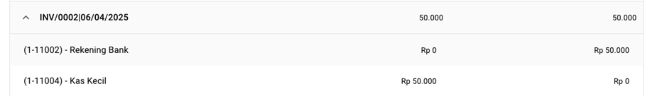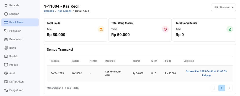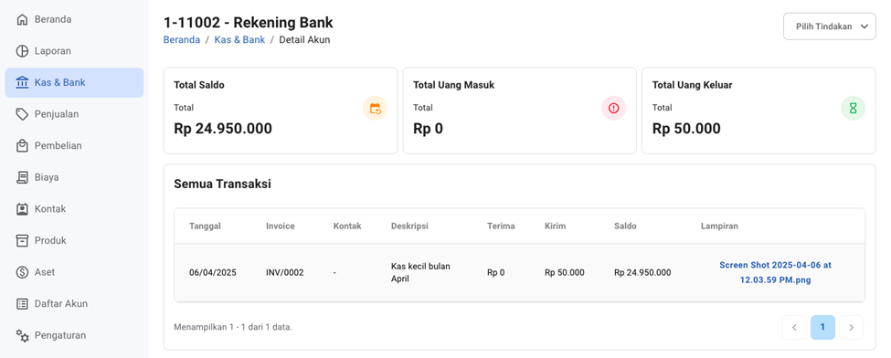 Riwayat transfer dapat dilihat pada nama akun terkait di menu Kas & Bank