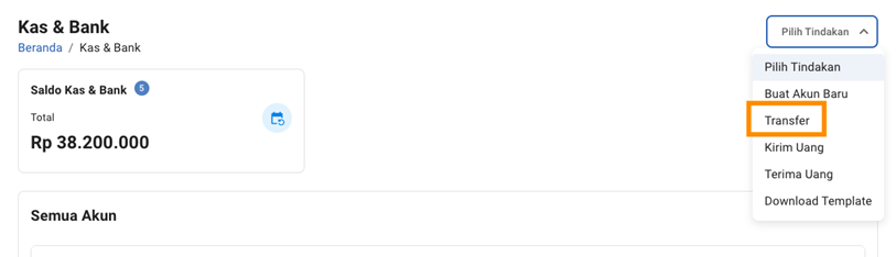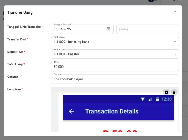 Melalui fitur ini, pengguna dapat mencatat setiap transaksi perpindahan saldo antar akun secara sistematis, sehingga mutasi dana tetap terpantau dengan jelas dalam sistem akuntansi. Dengan pencatatan transfer yang rapi, saldo pada masing-masing akun akan selalu terbarui sesuai kondisi sebenarnya.