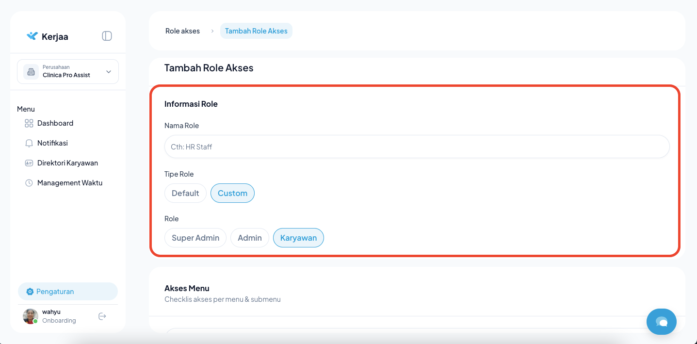 Fitur Role Akses memungkinkan Anda mengatur siapa saja yang bisa melihat atau mengubah data tertentu di aplikasi. Anda bisa menyesuaikan akses ini secara spesifik (Custom).