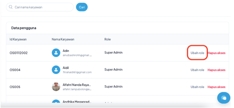 - Sistem akan memunculkan daftar Karyawan yang sudah ada di sistem. Pilih akun yang ingin diubah aksesnya, lalu klik Ubah Role.